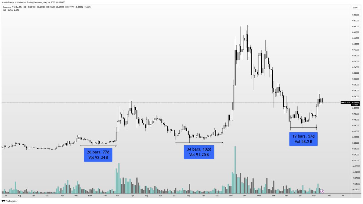 According to analyst Altcoin Sherpa, DOGE spent roughly two months in a choppy consolidation phase before making a strong upward move.