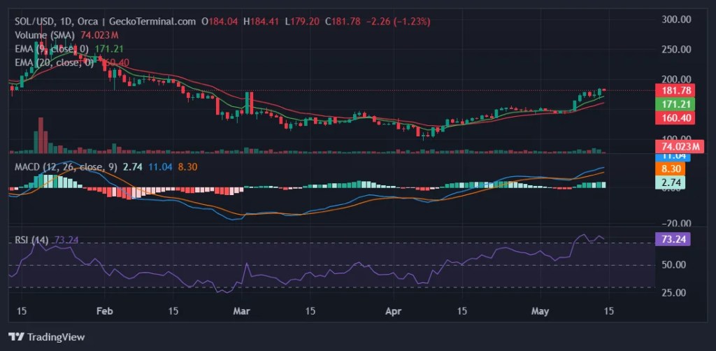 The 9-day and 20-day moving averages both show upward momentum, reflecting that the short to medium-term trend continues to show strong bullish momentum. Solana is steadily trading above both of these EMAs, indicating continued market support from buyers.