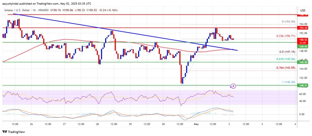 The price broke above a key downward trend line with resistance at $149 on the hourly chart for the SOL/USD pair. It even went above the $150 resistance level. The highest point reached was $153.90, and now the price is holding steady after the rise.