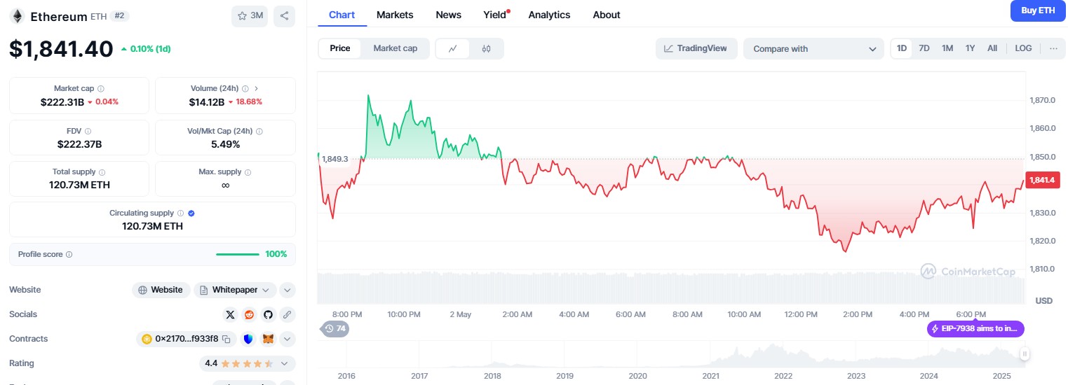 ETH is currently trading at $1,841, above the 9-day simple moving average, with the relative strength index at 58.3, suggesting building momentum.