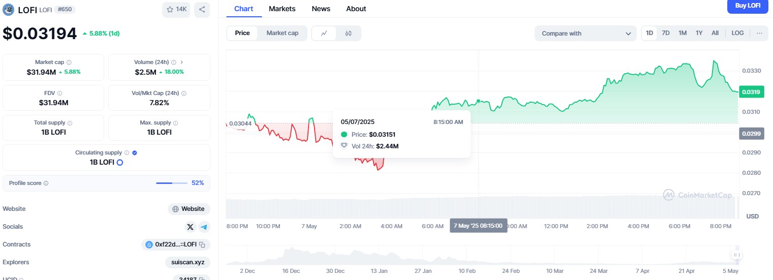 With a circulating and maximum supply of 1 billion tokens, LOFI currently holds a market cap of $31.95 million.