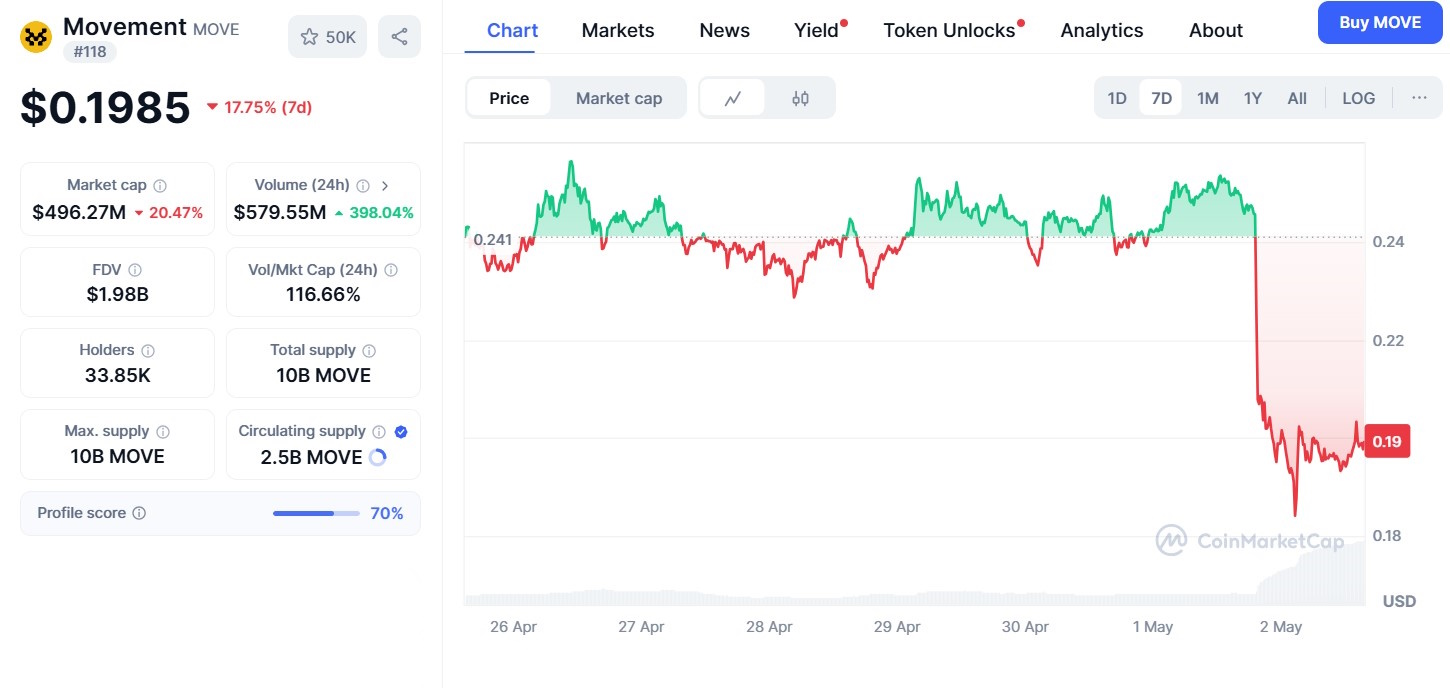 Following Coinbase’s May 1 limit-only notice and the formal delisting announcement, MOVE’s price plunged by over 20% to an all-time low near $0.18, before rebounding to $0.1985 at press time
