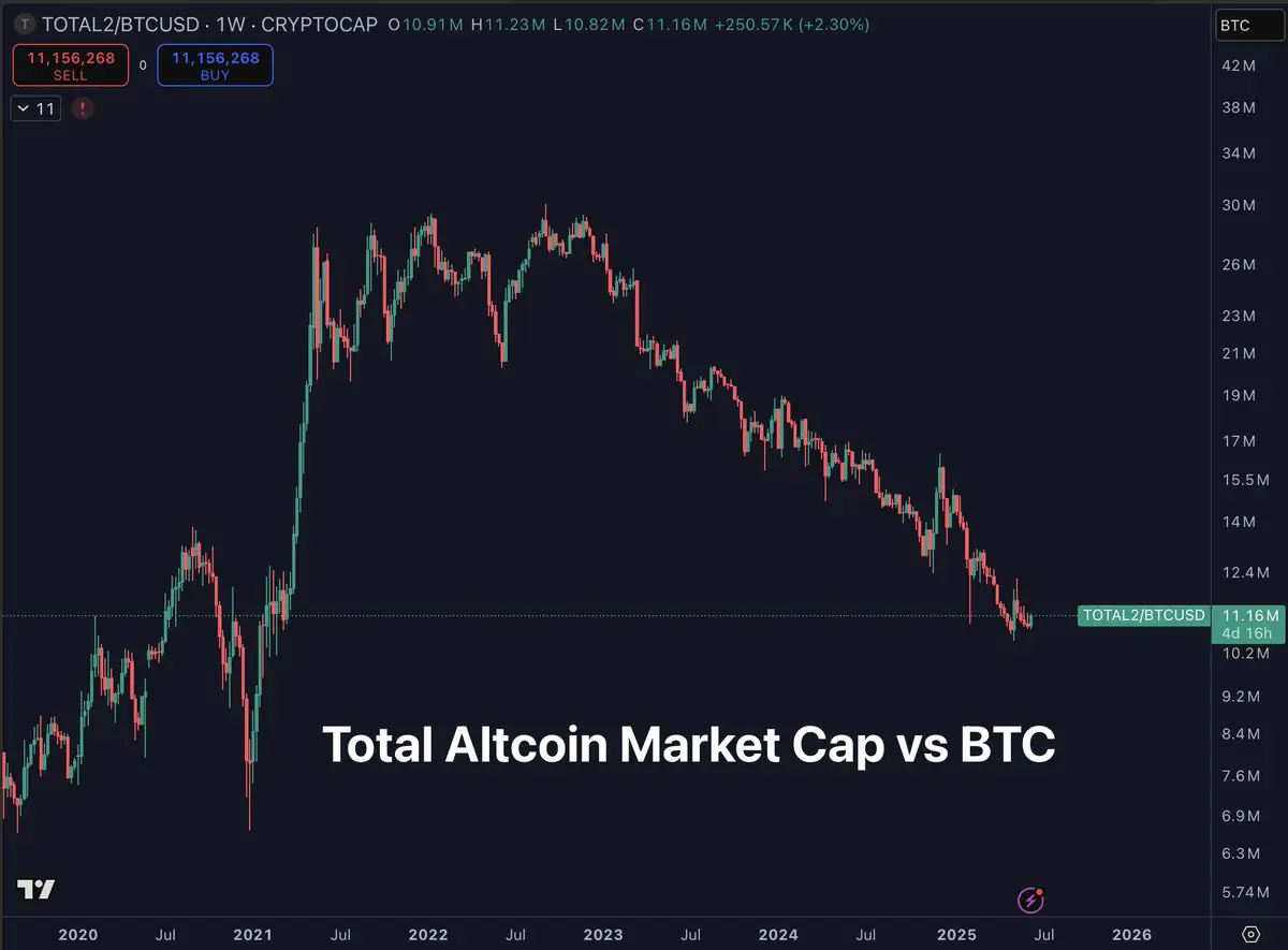 Using the TOTAL2/BTC chart — which tracks the combined market capitalization of altcoins relative to Bitcoin — the data indicates prolonged underperformance, with little evidence of a recovery.