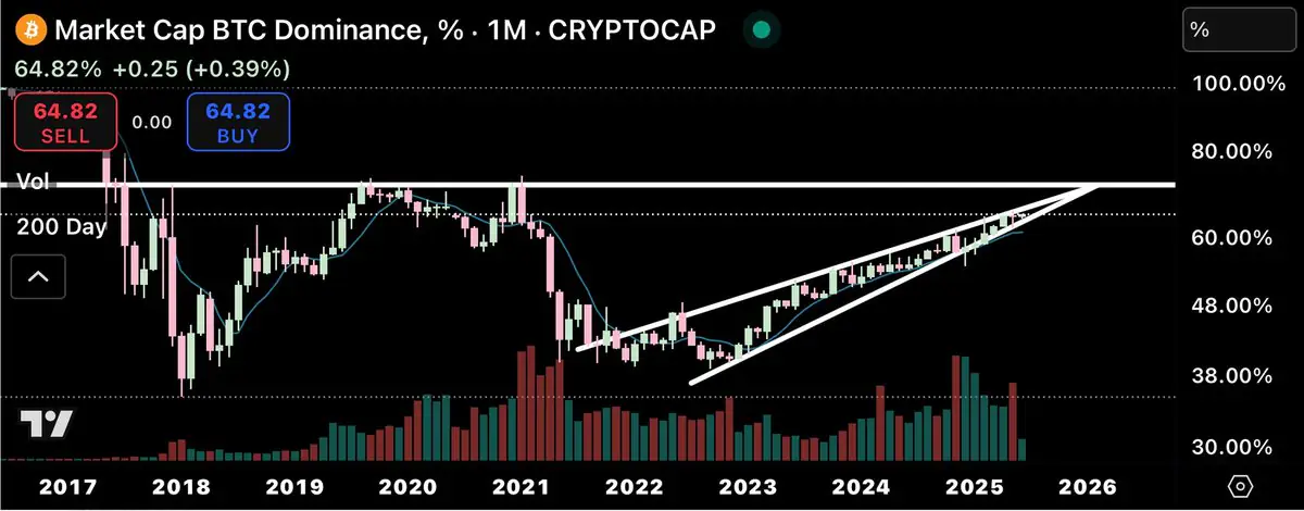 Meanwhile, CryptoBull points to Bitcoin dominance forming a rising wedge, a technical pattern suggesting a nearing breakdown.