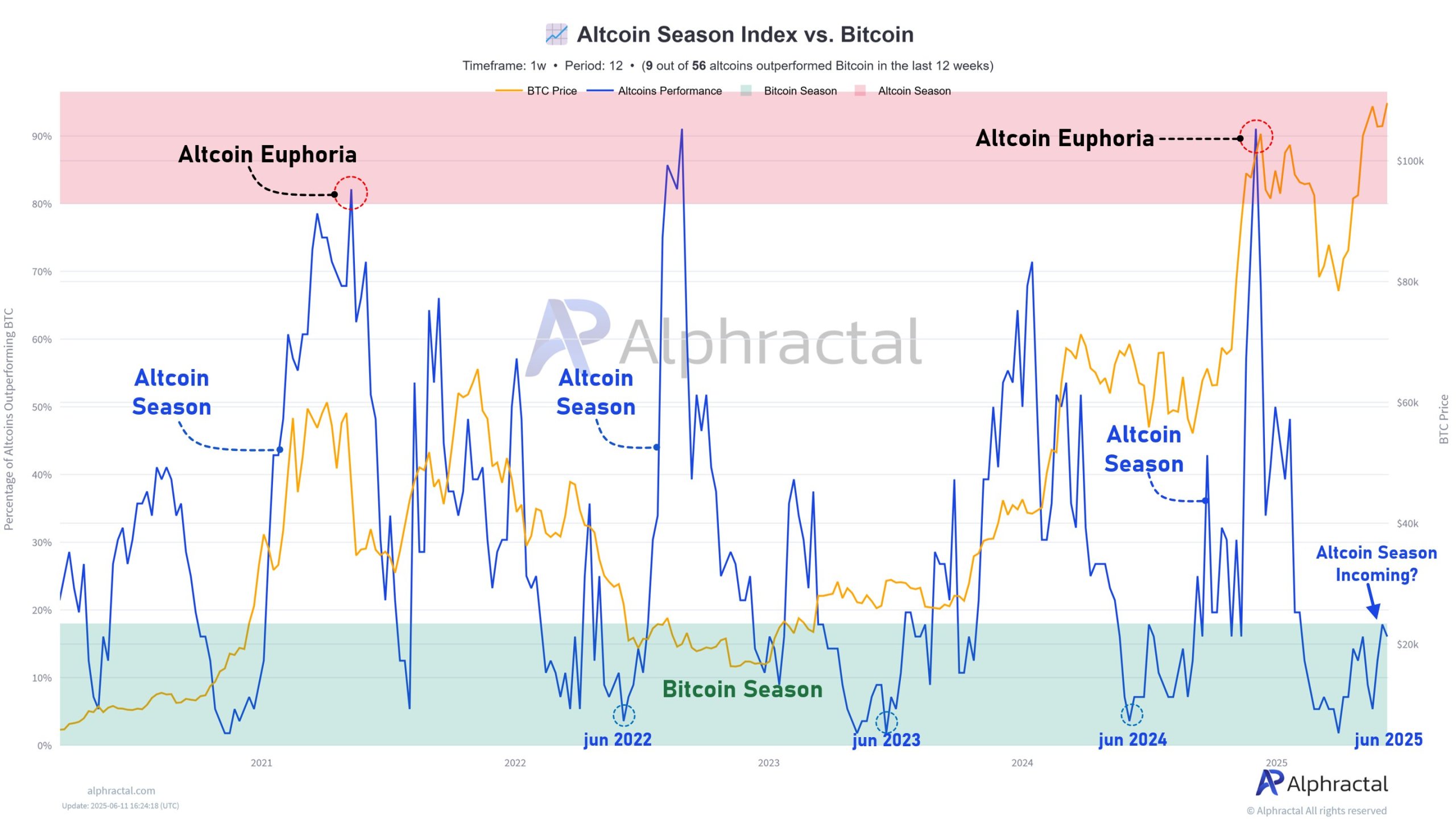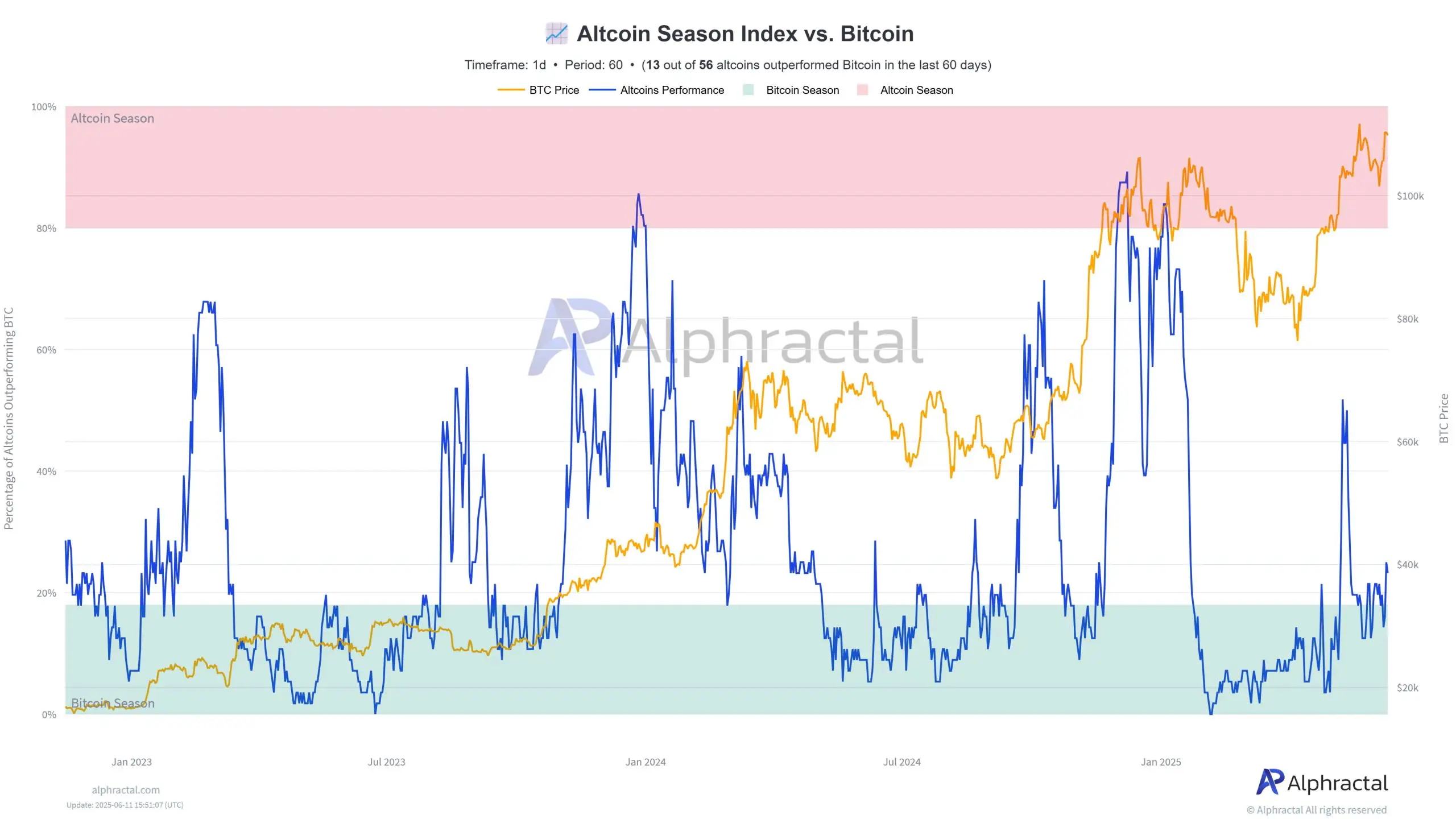 One compelling observation from Alphractal’s data: since 2022, every June has marked the beginning of an Altcoin Season. With June 2025 now underway, and the Altcoin Season Index already emerging from the BTC-dominant zone, market watchers are on high alert. Currently, 23% of altcoins are outperforming Bitcoin — a sign of increasing strength beneath the surface.