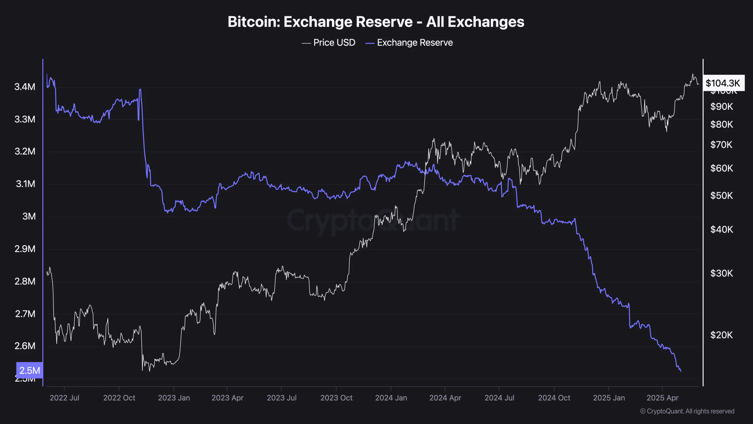 As of late May 2025, total BTC held across all centralized exchanges has fallen to 2.5 million, the lowest level in over three years.