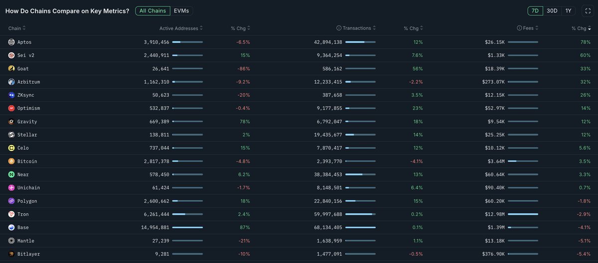 Leading the pack with a remarkable surge in fees is Aptos, which saw an impressive +78% growth in the past week. This substantial increase suggests a significant uptick in demand for transactions on the Aptos network, indicating growing adoption and application usage.