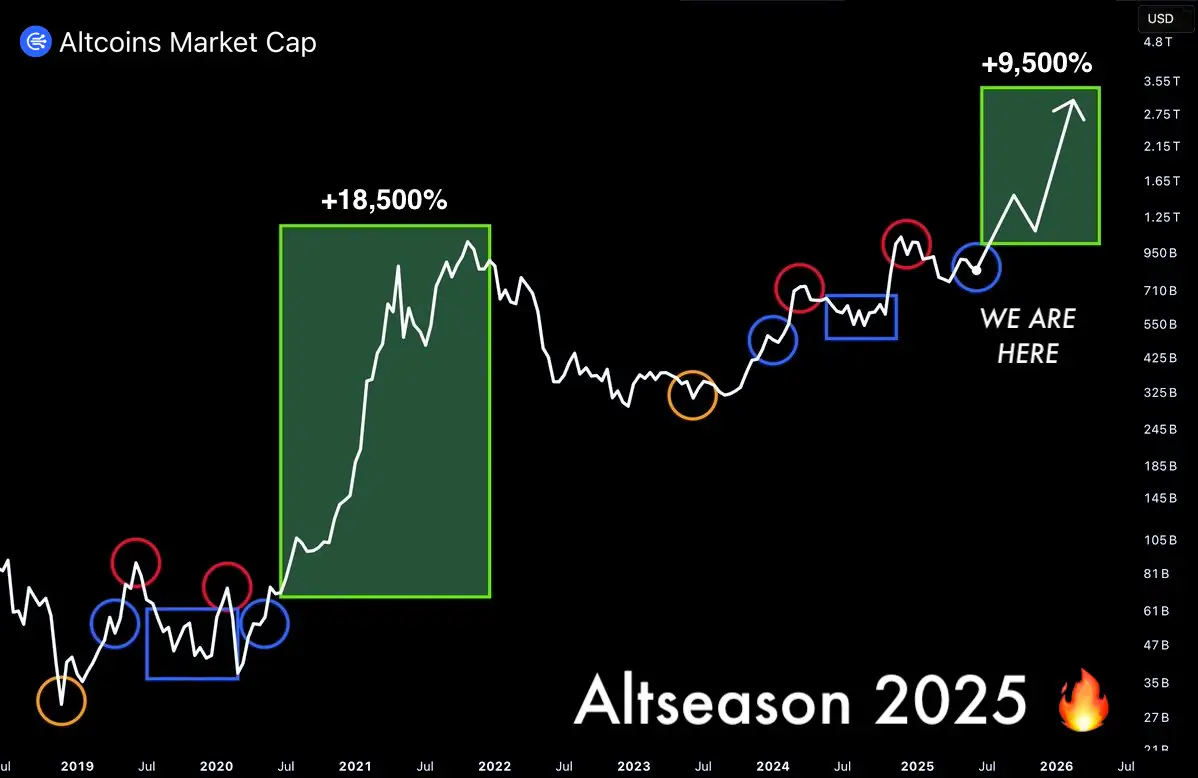 OxNobler shared his own success story from 2021, where he turned “$400 into $200K on alts” by spotting a similar setup. His chart, labeled “Altseason 2025,” shows the “Altcoins Market Cap” undergoing similar consolidation phases (marked by red and orange circles) before parabolic surges (green boxes).