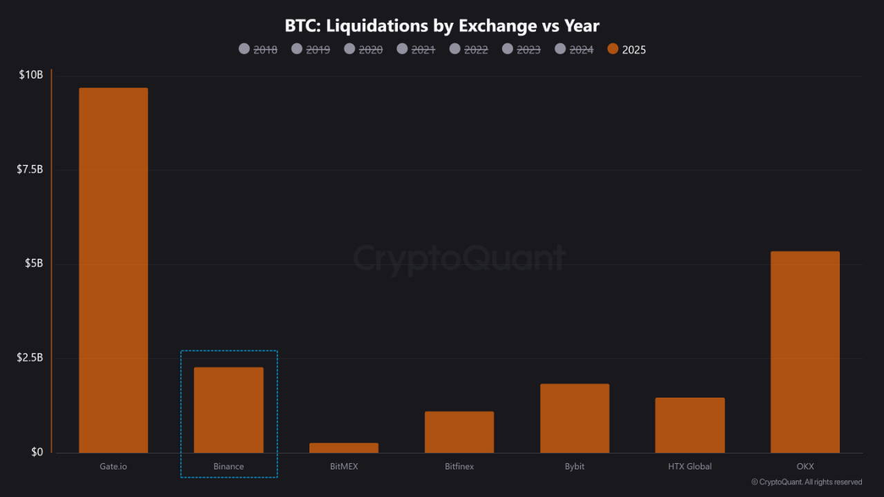 While Binance remains the top player in both spot and derivatives volume, it’s surprisingly not the exchange with the most liquidations in 2025. Data shows OKX and at least one other exchange surpass Binance in total liquidations this year.