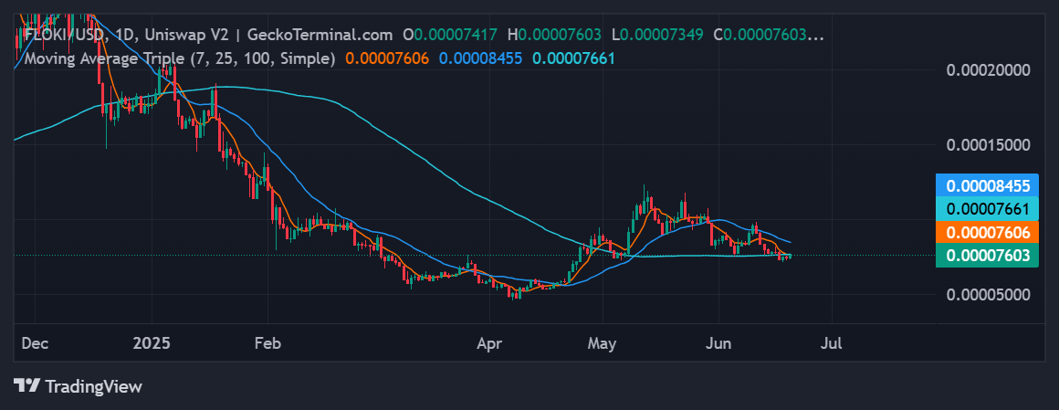 The 7-day moving average is now at $0.00007606, slightly above the 25-day average of $0.00008455, while the longer-term 100-day moving average sits at $0.00007661.