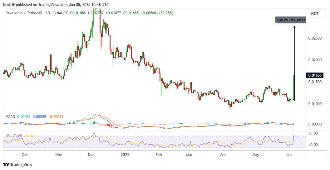 RVN coin’s surge saw it hit highs of $0.027, its highest level since mid-December 2024.