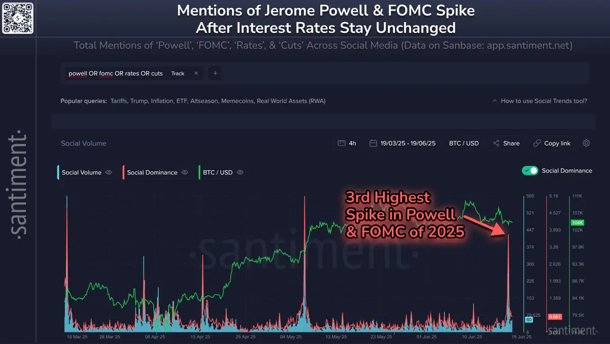 According to data from Santiment, mentions of Powell and the FOMC spiked to their third-highest level in 2025, underlining the heightened attention the issue has drawn among traders and analysts.