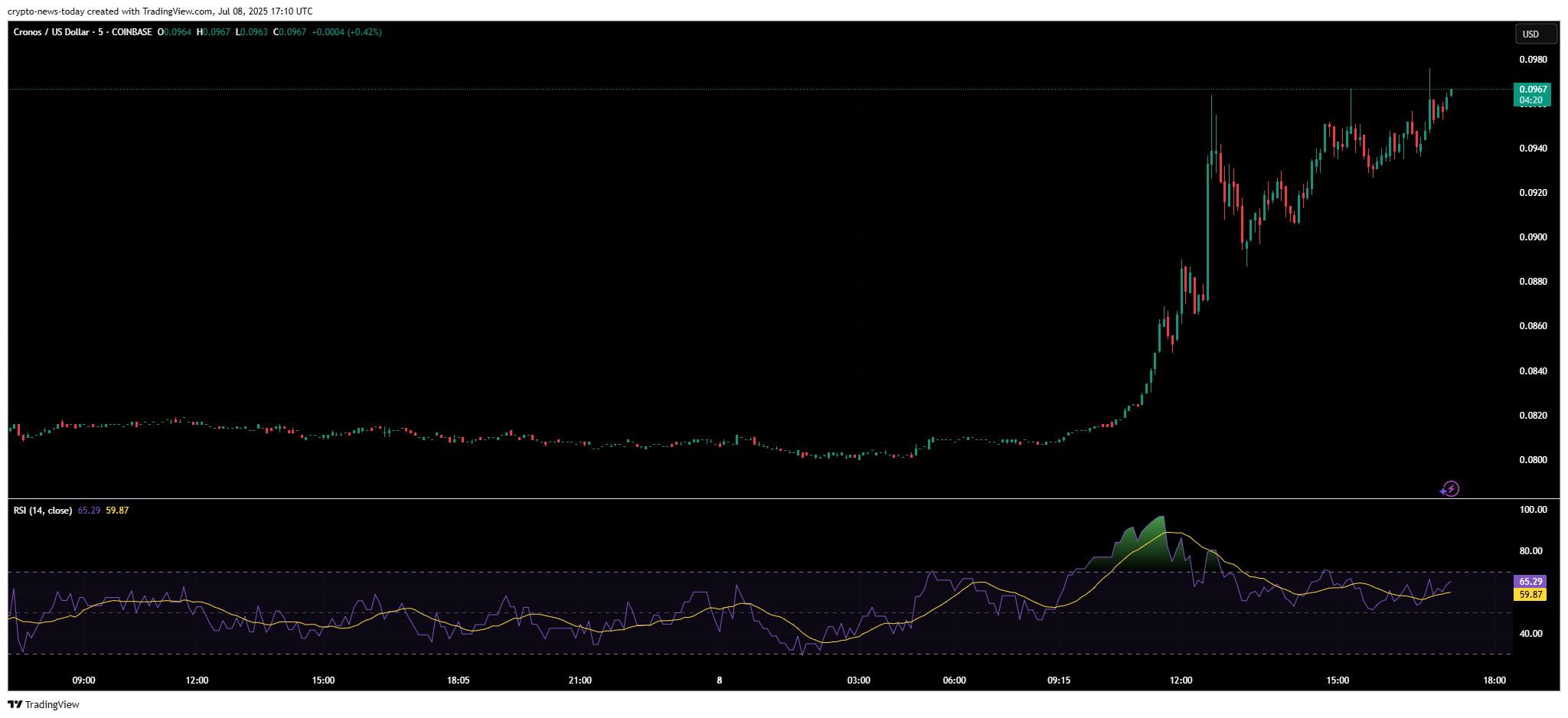 CRO’s inclusion helped push the token to a one-week high of $0.0972, breaking out from months of sluggish price action. While BTC, ETH, and SOL showed little reaction, CRO became the center of attention, partly due to its less liquid market structure and heavy trading volume on Korean exchanges.