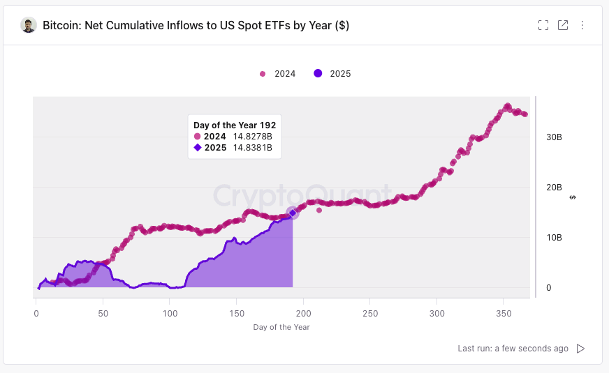 According to CryptoQuant’s Head of Research Julio Moreno, cumulative inflows into these ETFs have reached $14.84 billion so far this year, slightly edging out the $14.83 billion recorded by the same point in 2024.