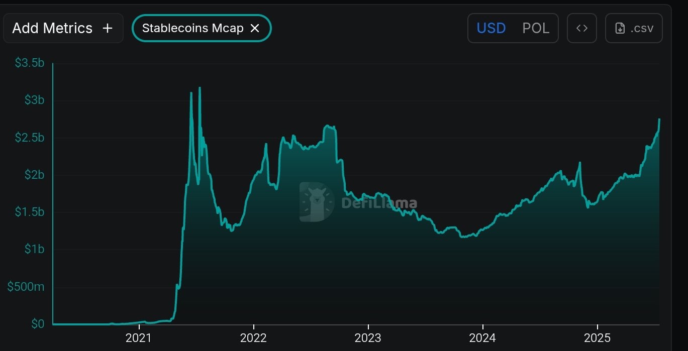 The chart accompanying the announcement, sourced from DeFiLlama, shows a clear upward trajectory in stablecoin market cap on Polygon, accelerating sharply through 2025.