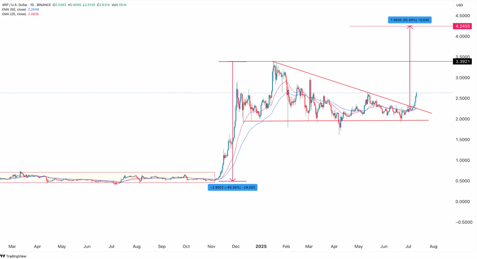 After months of trading sideways throughout 2024, XRP appears to have completed a lengthy consolidation phase. This period of quiet accumulation, which followed a breakout in late 2023, now seems to have evolved into a classic bullish pennant — a formation that often precedes further upside.