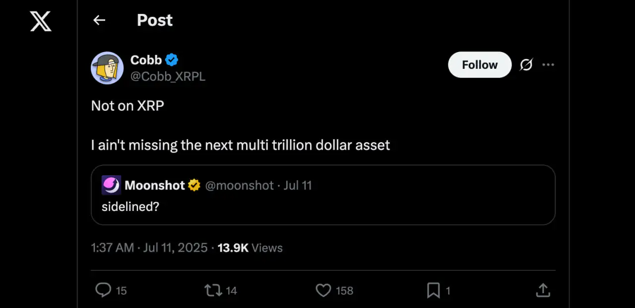 Cobb Alex, reacting to these predictions, stated that he’s not taking chances this time. He declared himself heavily positioned in XRP, citing his conviction that XRP could become a multi-trillion-dollar asset. For reference, XRP above $22 would already bring its market cap to over $2.84 trillion, assuming today’s circulating supply.