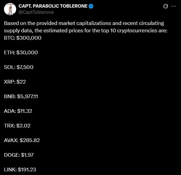 Meanwhile, he predicted the prices of other assets, including Bitcoin, Ethereum, and Solana. According to his analysis, BTC would reach $300,000, ETH would get to $30,000, and SOL would reach $7,500.