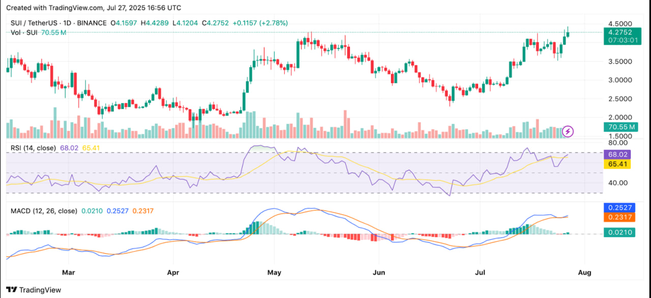 Sui’s rally was fueled by speculation around a potential exchange-traded fund (ETF). The U.S. Securities and Exchange Commission acknowledged a filing by 21Shares for a possible SUI ETF, which drove renewed confidence in the token. Though the ETF has not been approved yet, the news triggered a sharp rise in both price and trading volume.