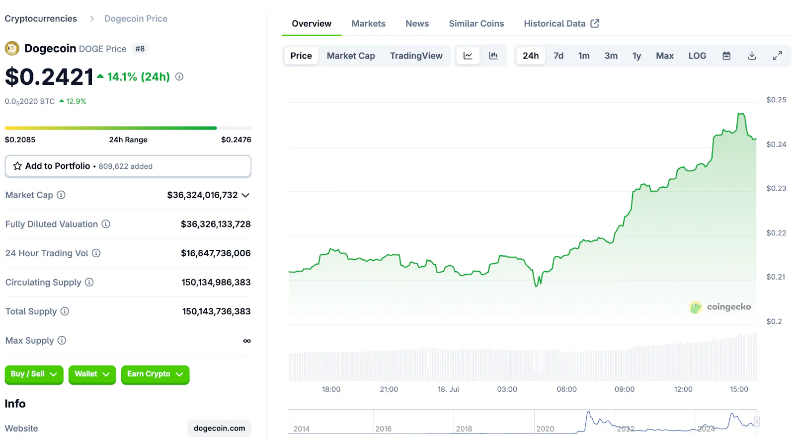 Dogecoin (DOGE) may no longer be in its infancy, but its meme legacy continues to impact the presale space. DOGE’s resurgence has revived interest in meme coins, making way for newer entrants like FloppyPepe. Although DOGE isn’t in a presale phase, its cultural momentum still influences emerging tokens and sets a high bar for virality. Current price hovers at $0.2421, with sideways action suggesting that speculative capital is rotating into microcaps and new launches.