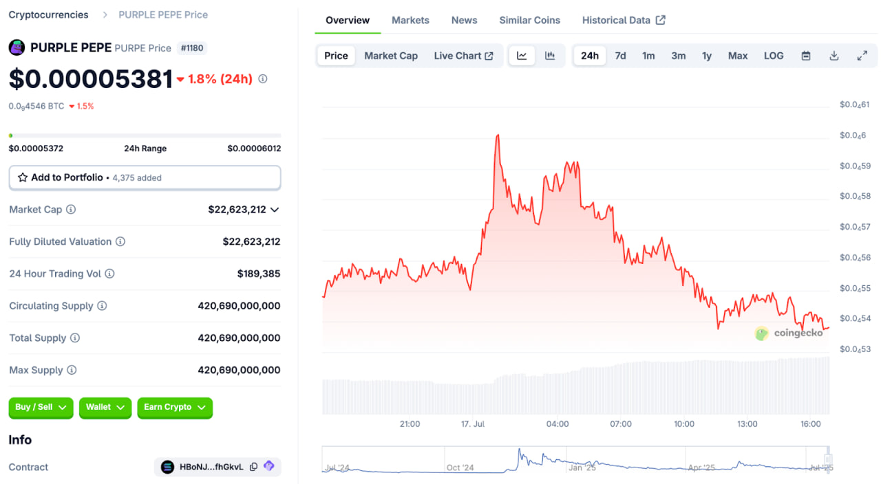Currently trading at $0.00005381, PURPE carries a market cap of about $23 million with a 24-hour volume near $1.9 million. It has rebounded roughly 10% this week, though it still sits 82% below its late-2024 all-time high. Built on Solana, PURPE gained traction through airdrops, NFTs, and even real estate test payments, drawing attention from the WallStreetBets crowd.