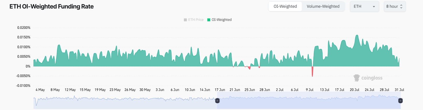 As of Thursday, the annualised funding rate for ETH perpetual futures had fallen back to 9%, down from 19% earlier in the week, with the ETH OI-weighted funding rate dropping to 0.0043% from 0.0163% on July 21.