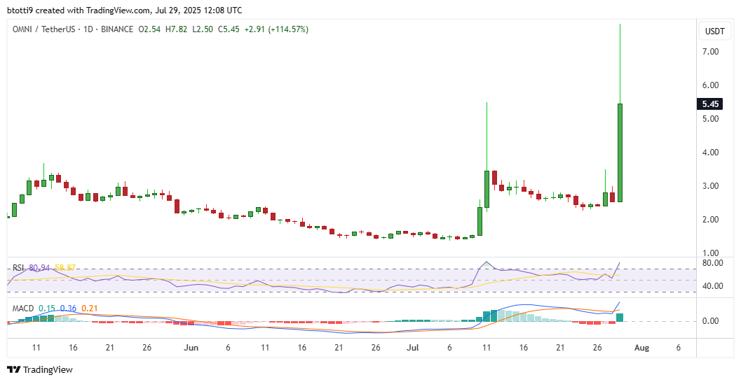 The near triple-digit gain saw OMNI extend gains over the past month to over 250%. Bulls were also up 285% since the all-time lows of $1.37 reached on July 6, 2025.