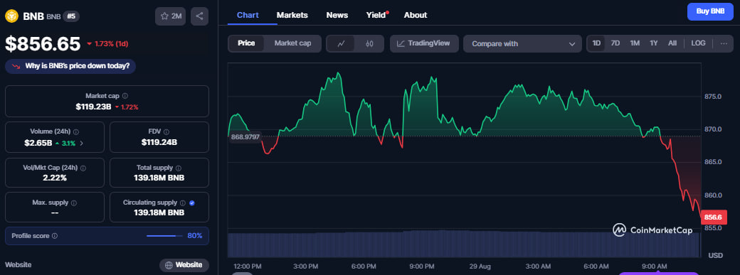 Binance’s native token took a hit amidst the development, plunging from daily highs of $876 to $856 within minutes.