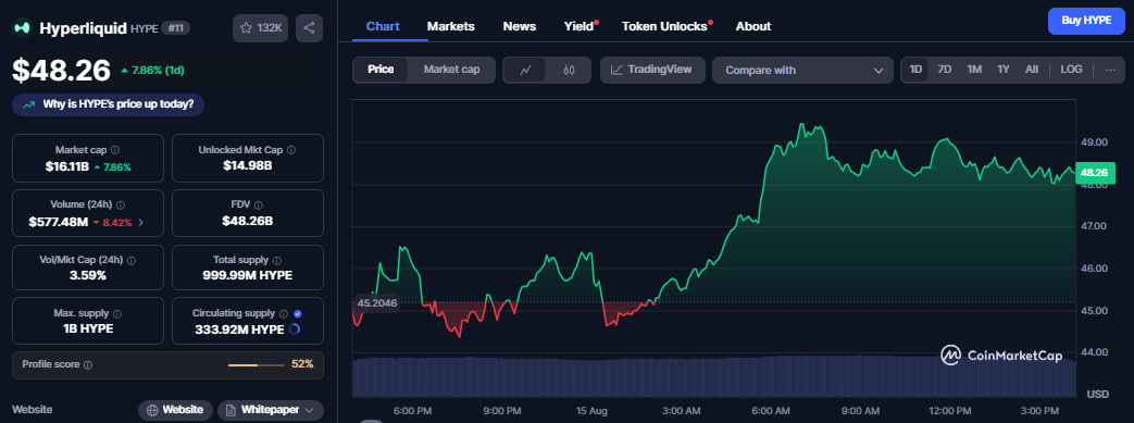 HYPE trades at $48.26 after a 15% weekly gain.