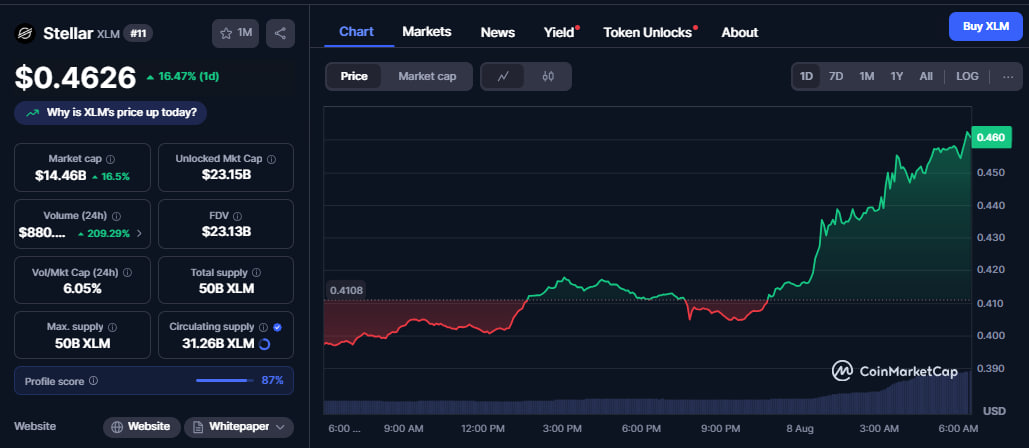 XLM has climbed from $0.36 on August 2 to today’s intraday highs above $0.46.