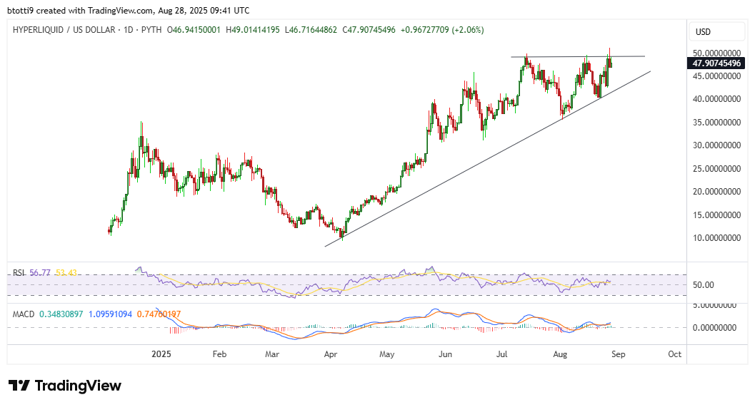 However, HYPE has pulled back slightly, with profit-taking currently seeing the token hover above $48.