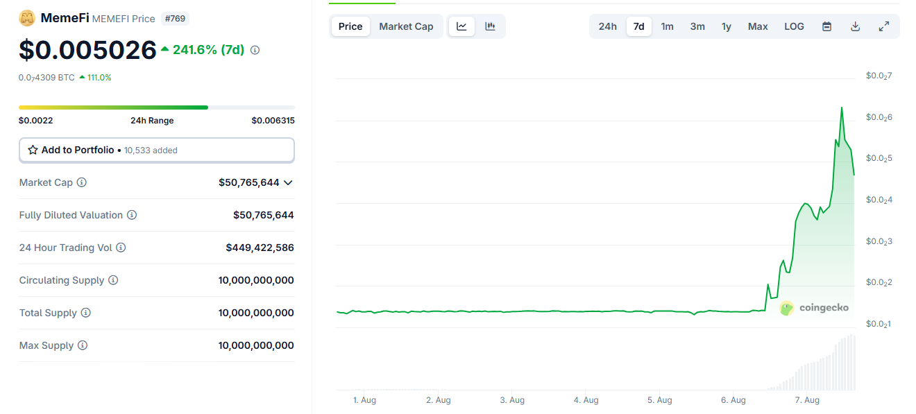 This has forced a wave of short liquidations, reportedly triggering nearly $376 million in trading volume in just one day, propelling MEMEFI to over $0.0063 from levels below $0.002, although it has slightly pulled back to around $0.005026.