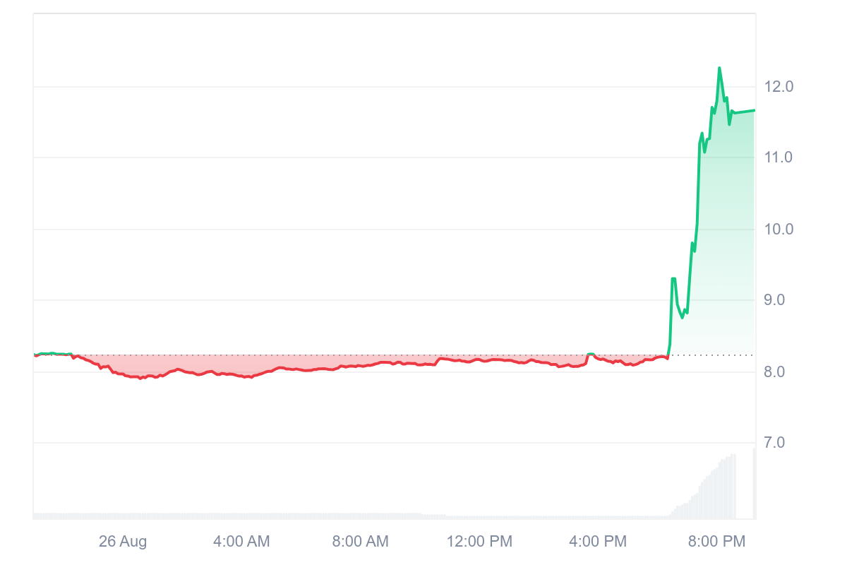 On Aug. 26, the Numerai team announced that JPMorgan has secured $500 million in capacity in Numerai, triggering the sharp price surge. Gains outpaced Cronos (CRO), which spiked after Trump Media announced a partnership with Crypto.com.