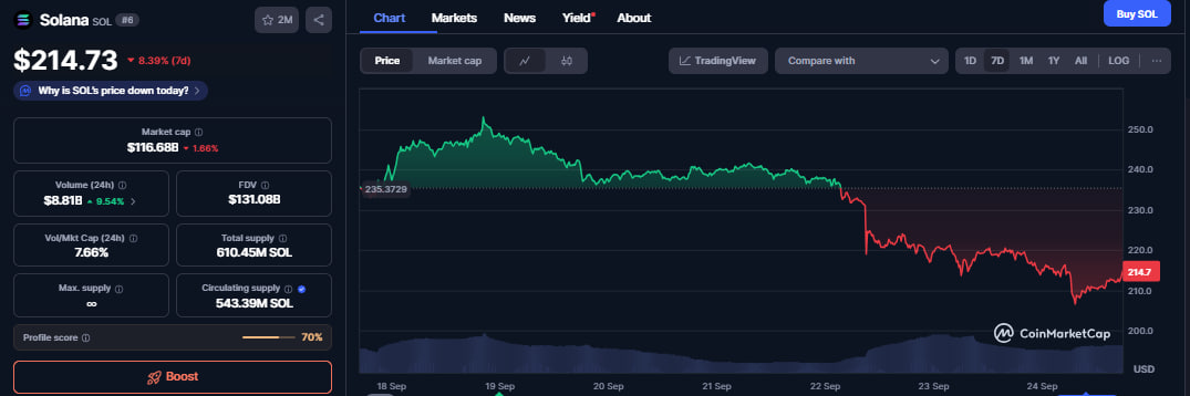 SOL is trading at $214 after losing 8% and 2% the past week and day.