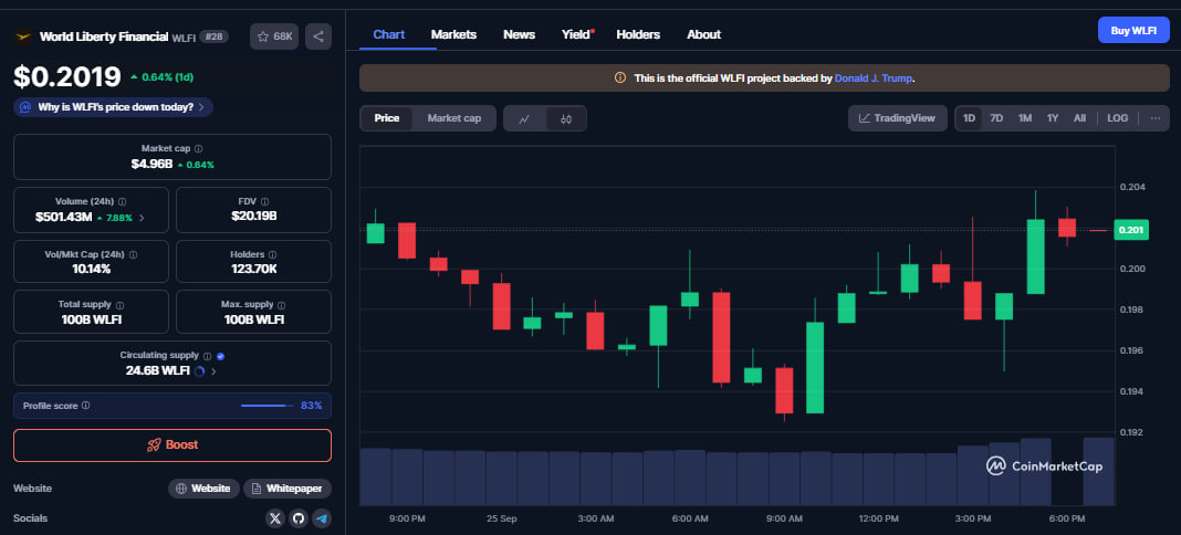 WLFI trades at $0.2019 after a 0.64% increase on its daily chart.