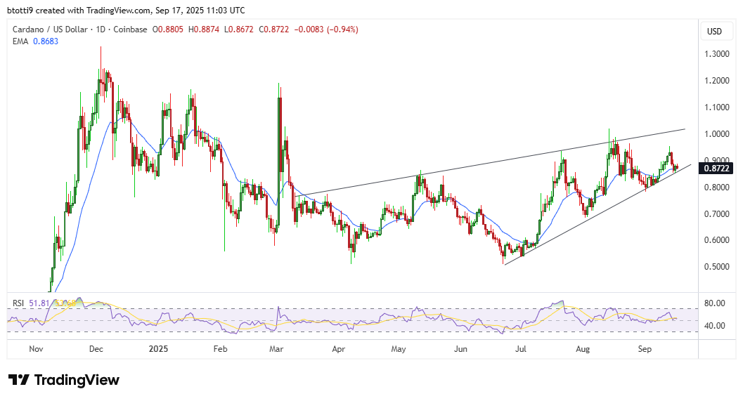 Cardano (ADA), with its price around $0.87, remains among the top 10 cryptocurrencies by market cap despite bulls struggling over the past month.