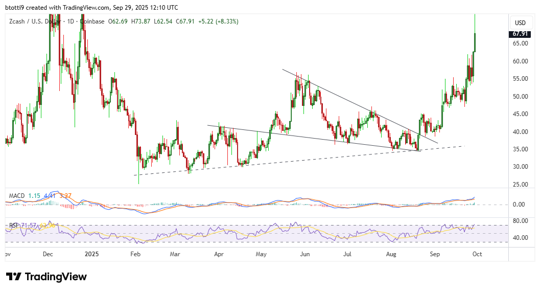 ZEC rallied by more than 23% in 24 hours to jump from lows of $54 to above $69, marking a return to levels last seen in December 2024.