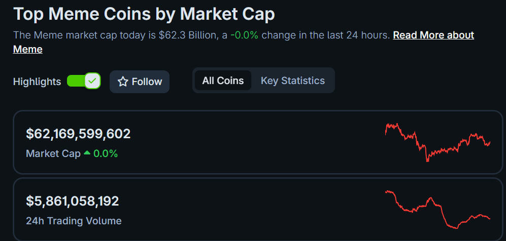CoinGecko data shows the value of all theme coins remained unchanged at above $62 billion.