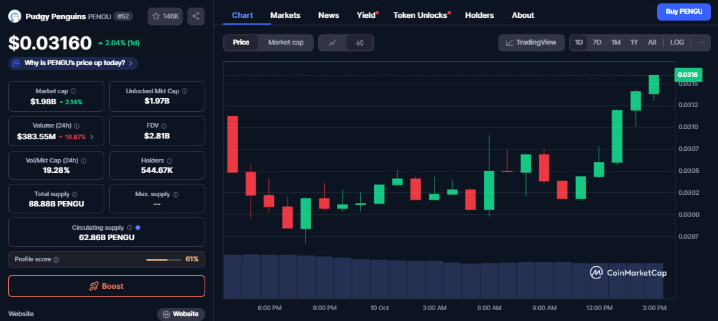 - PENGU has gained more than 2% after the announcement.