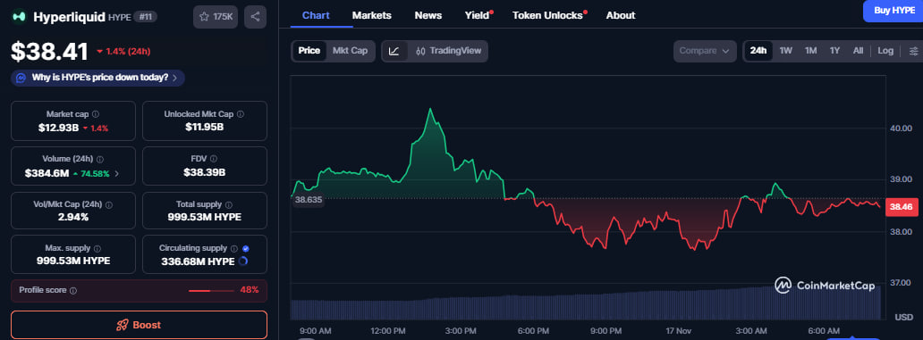 HYPE remained relatively stable the past 24 hours, losing only 1.40% to trade at $38.41.