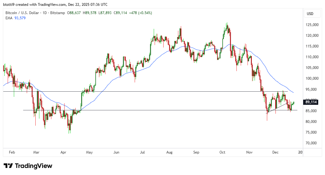 Bitcoin has staged a notable recovery in the early trading session on Monday, December 22, as the price climbed back above the $89,000 mark.