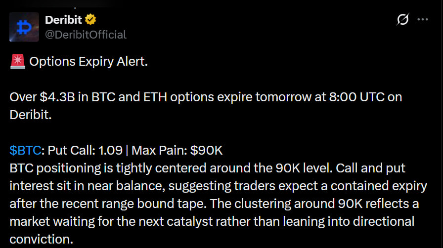 BTC positioning is tightly centered around the $90K level. Call and put interest sit in near balance, suggesting traders expect a contained expiry after the recent range-bound tape.