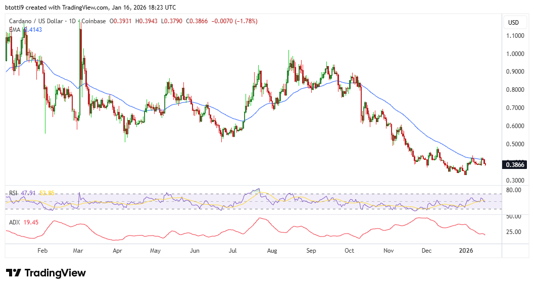Cardano’s ADA token is down and faces a brutal supply wall near $0.40, where relentless selling pressure threatens to derail bulls’ hopes of an extended upside.