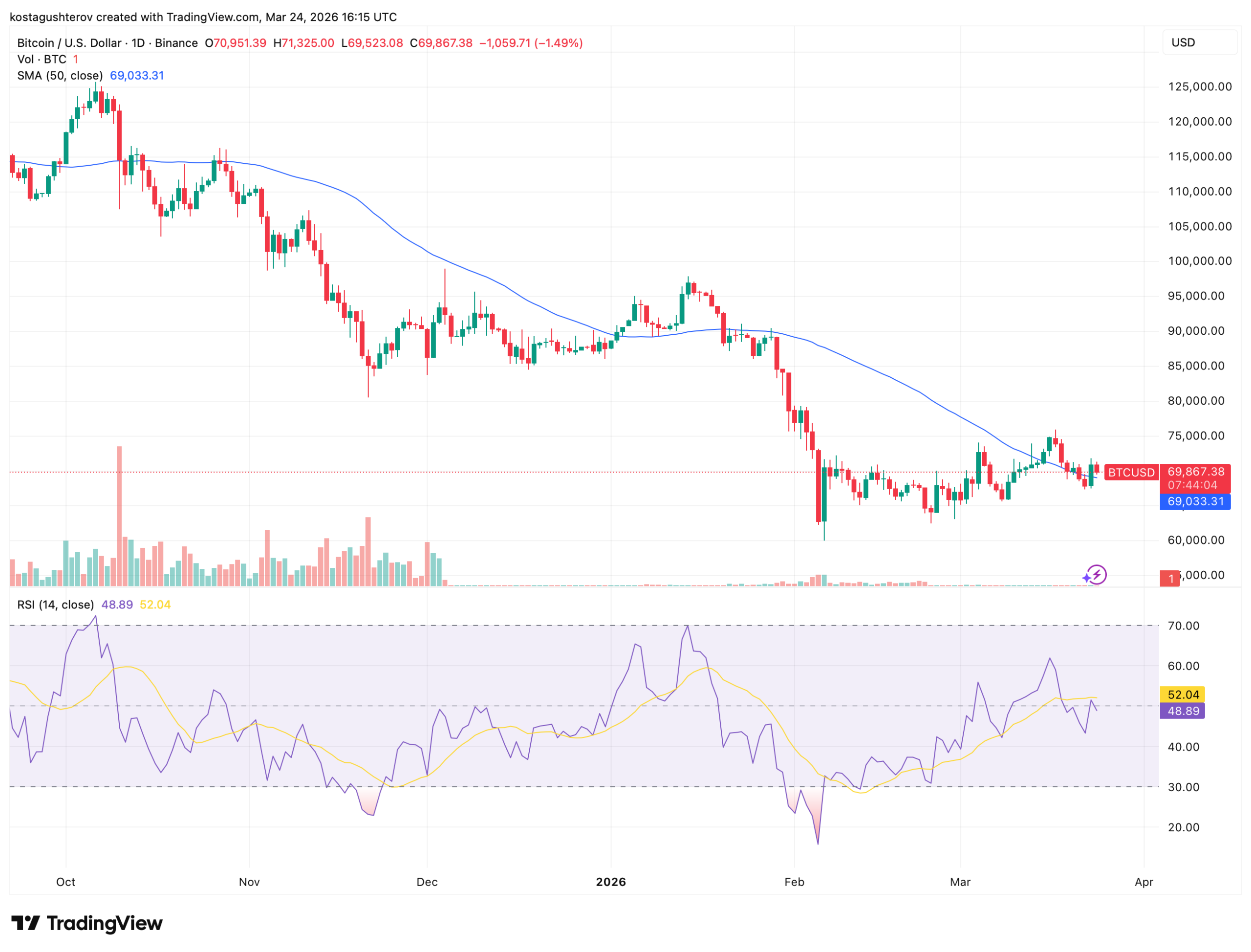 Bitcoin is trading at $69,867 at the time of writing. The daily chart shows a downtrend from above $125,000 in October through a low near $60,000 in early February. Price recovered through late February and into March, briefly crossing above $75,000 before pulling back. The 50-day moving average sits at $69,033 and is still declining. Bitcoin is trading just above it.