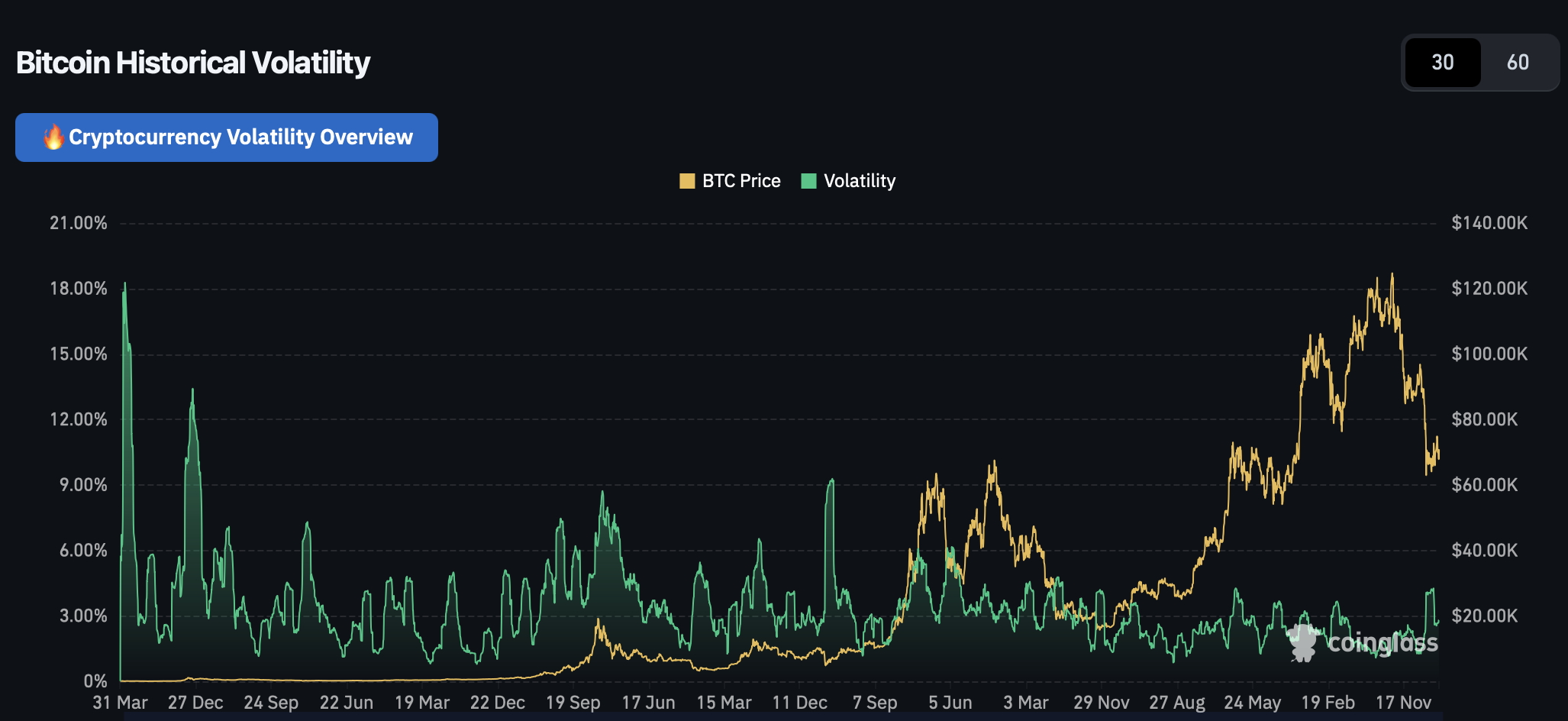 CoinDesk concluded that if history is a guide, the Bitcoin downtrend that began in October above $126,000 has already ended. Their implied floor from the volatility pattern sits near $60,000, the level reached during the February capitulation.