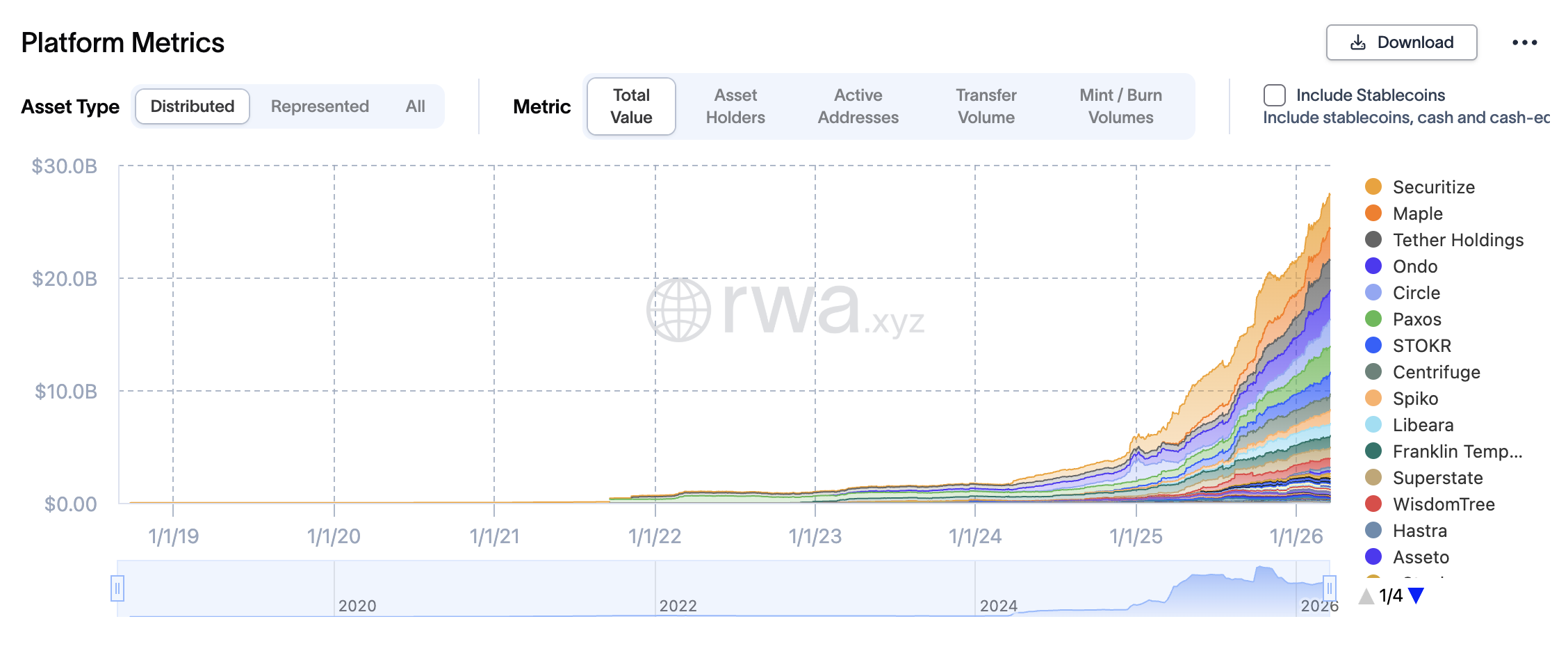 The RWA.xyz platform metrics chart shows Securitize holding the largest single block of TVL among named platforms – a position built largely through its role as the issuance infrastructure for BlackRock’s BUIDL fund rather than through retail stock tokenization. Platforms like Franklin Templeton, Centrifuge, and Ondo itself are visible in the chart’s stacked layers, with growth across most players accelerating sharply from 2025 onward.
