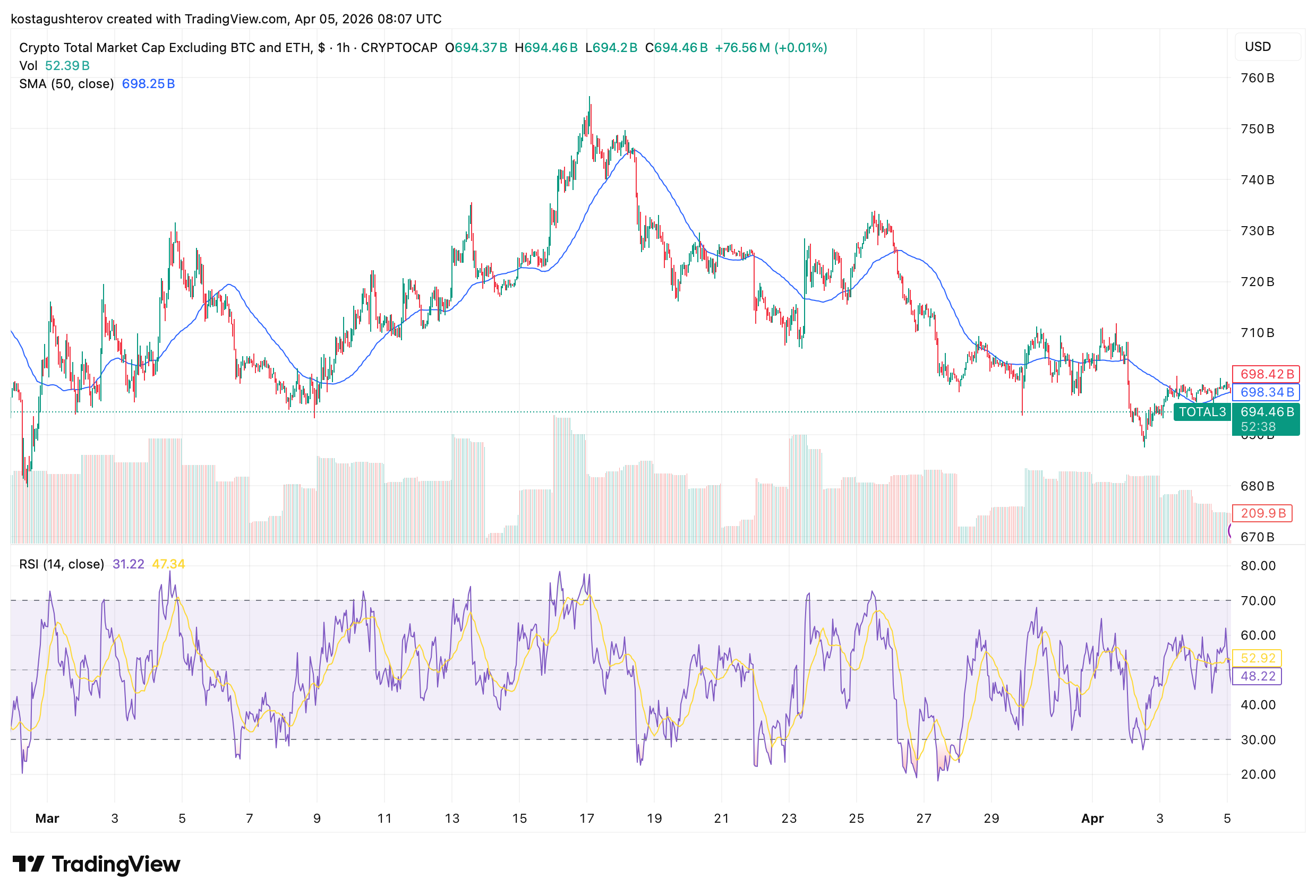 The altcoin market excluding Bitcoin and Ethereum is at $694 billion as ofApril 5, below the 50 SMA at $698.25B and approaching it from below with RSI at 31.22. That RSI reading is close to oversold territory. Fresh selling arrived on April 5 morning, pushing the market cap back toward support after a brief recovery on April 3 and 4.