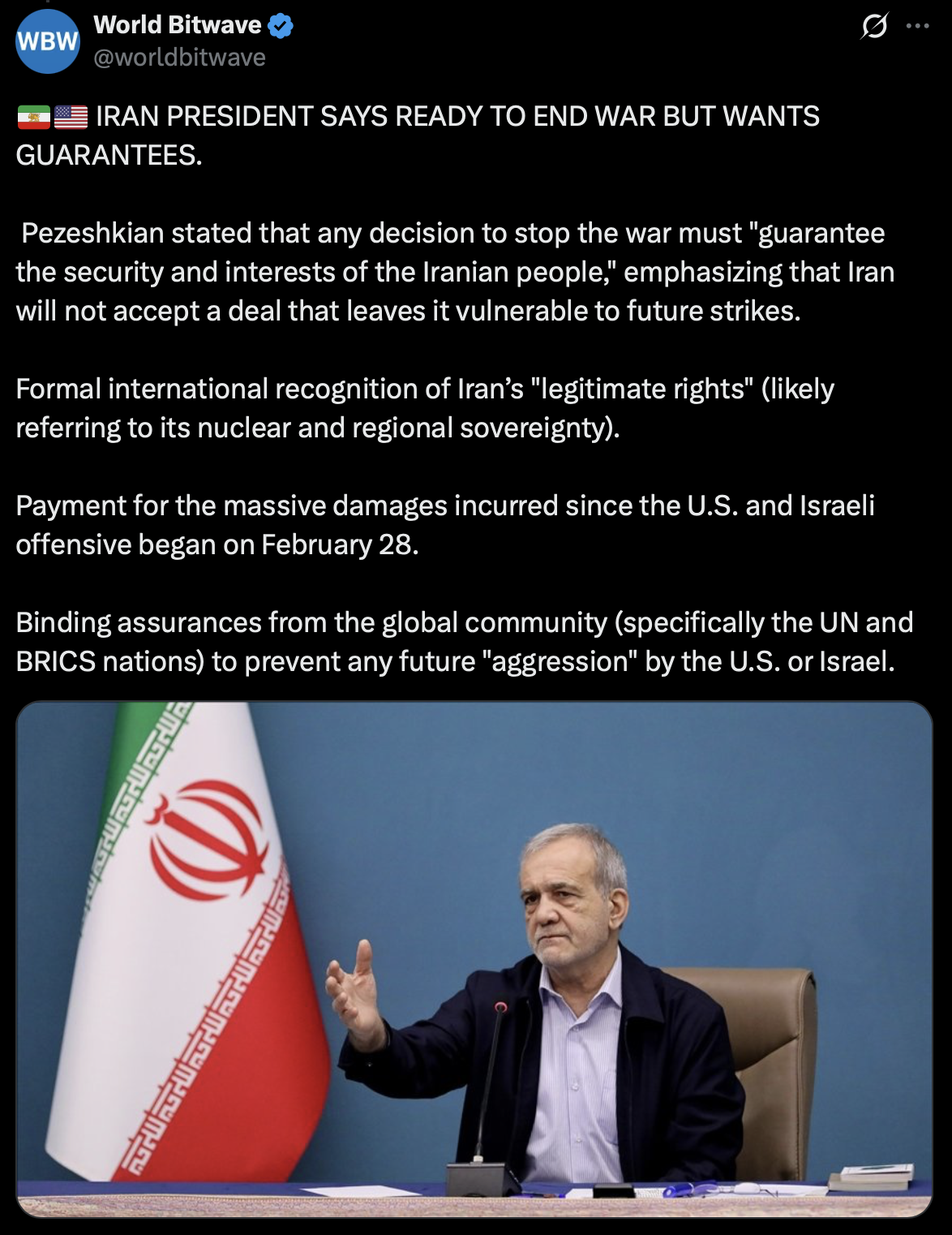 1. Security and interests guaranteed. Any decision to stop the war must “guarantee the security and interests of the Iranian people,” Pezeshkian said – signaling Iran will not accept a deal that leaves it exposed to future military strikes.