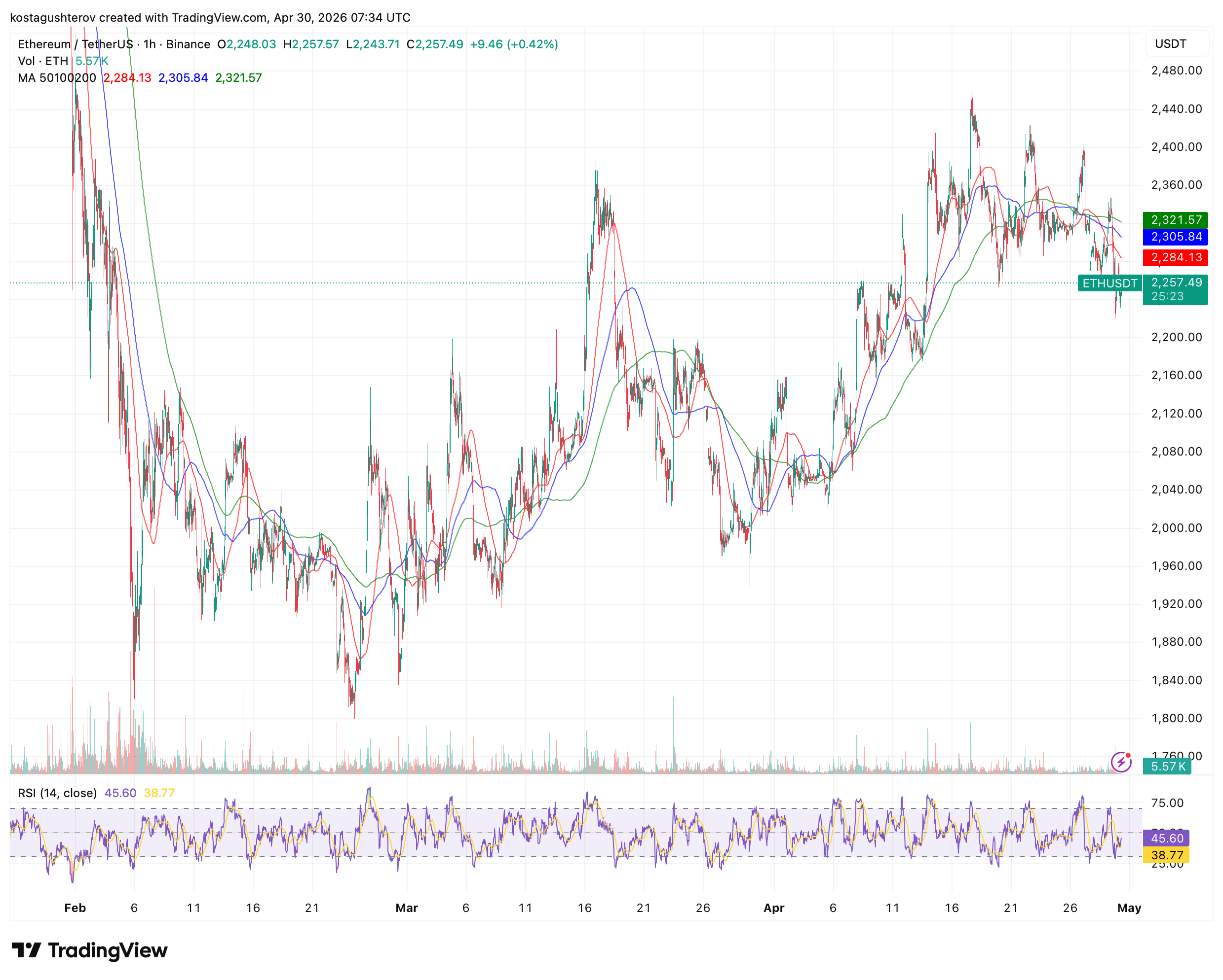 The most important technical detail on the hourly chart is not the price level. It is the divergence between the two RSI signals. The faster RSI at 45.60 is in neutral territory and has already stabilized from its recent low. The slower RSI at 38.77 is approaching oversold and is still falling. The gap between them is 6.83 points, wider than it has been for most of the April period.