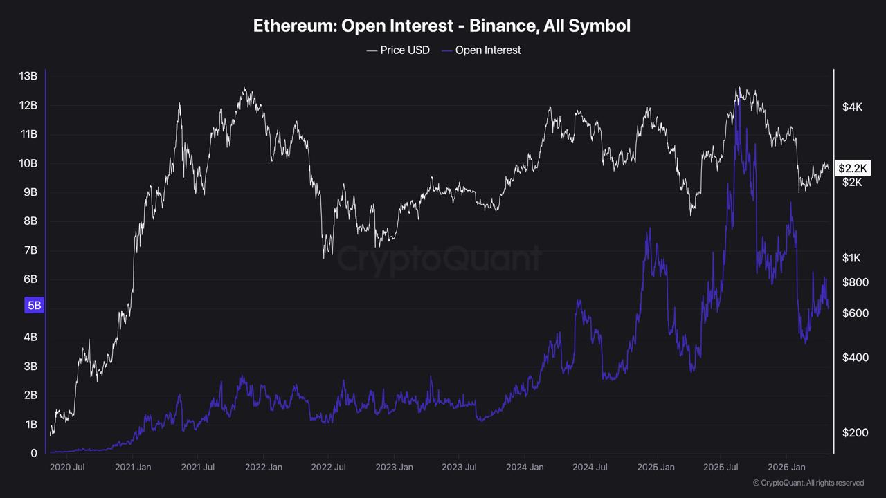 Ethereum open interest on Binance peaked at approximately 8.5B in January 2026 when price was trading between $3,200 and $3,400. The February collapse brought OI from 8.5B to approximately 3.8B, a 55% reduction as leveraged positions were liquidated across the decline to $1,750. Since the February low, OI has recovered to 5B as price recovered to $2,257, a 31% OI recovery against a 29% price recovery. The two figures are nearly identical.